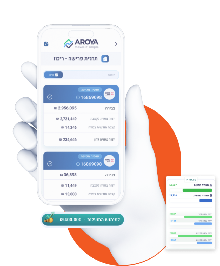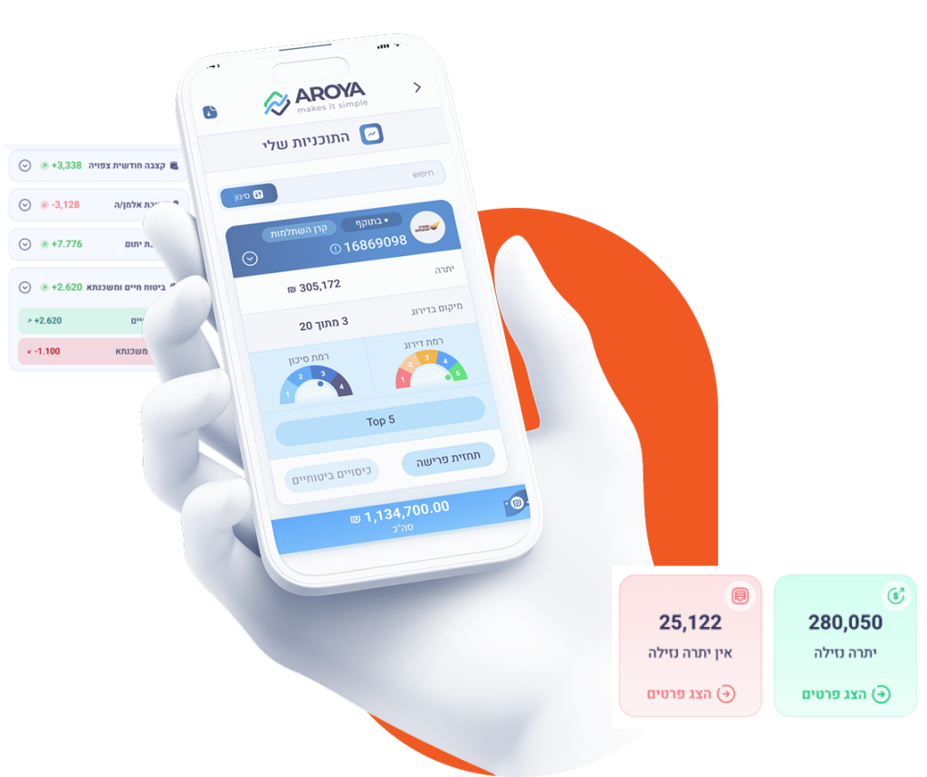 במקום להתמודד לבד עם הפנסיה, אפליקציית Aroya מציעה לכם ניהול פנסיוני חכם, מבוסס על אלגוריתם מתקדם ועל הידע של יועץ הפנסיה המוביל בישראל.